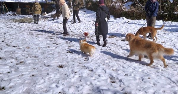 雪の白さに圧倒される人間と、いつもと違うにおいの風景に自然と地面に鼻を近づける犬達。