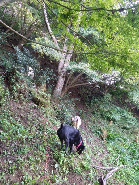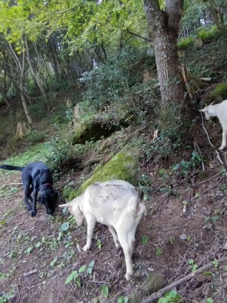 お休みのほとんどはジェイと山羊たちと共に山で過ごしました。いつもは係留しているヤギのアールとゼットをできるだけフリー活動させてあげたくて、アールとゼットを12メートルの長さのリードでつなぎ、ある程度はフリーで活動できる状態にして見守りました。三頭が集まっているのはケンポナシの木の下です。ケンポナシはクロウメモドキ科ケンポナシ属の落葉樹木です。この季節にケンポナシの実がたくさん落ちているのですが、三頭ともこの実を競って食べています。熟すとナシのような香りと味がして人も食べることできます。ときどき食べてみますがものすごく美味しいというわけではないのですが、甘いので犬が好んで食べるのはわかるような気がします。