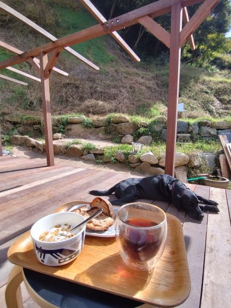 そして最後には小さな喜びであるランチタイムの写真です。ランチとして準備したのは、広島の有名なパン屋さんのパンと、うちのニホンミツバチたちからいただいた蜂蜜の入ったヨーグルトにきなこと黒ゴマをまぜたもの、そして自慢のうちの水でいれたコーヒーです。私のこれからの新たな“夢”が実現するのかどうかがつまった写真です。この夢は本当に小さな夢で、本当に実現するのかみなさんもいっしょに楽しんでいただけたらと思います。オポディまでお待ちくださいね。