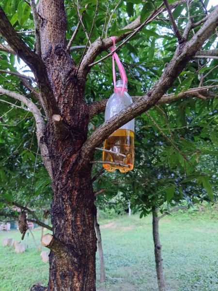 その対策とは、木酢を使うというものでした。木酢をクヌギの木につるしたり振りかけたりするとオオスズメバチが近づかなくなるらしいのです。木酢は様々な虫よけとして日常的に使っており、オポハウスには大量に常備してあります。早速、ペットボトルに木酢を入れて樹木に下げる備品を樹木の本数ほど準備しました。